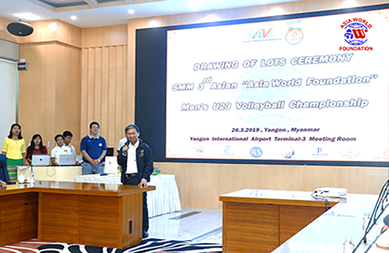 The group stage draws for the SMM 3rd Asian “Asia World Foundation” Men’s U23 Volleyball Championship was held at Yangon International Airport Terminal 3 corporate event hall on 26th March 2019 and Myanmar, the host of the tournament will play with Sri Lanka, Australia and EZ (HKG, MAC) in Group A according to the draw results. Japan, Kazakhstan, WZ-2 (BRN, KSA, PLE, QAT, KUW, IRQ, UAE) and Vietnam Teams in Group B, Chinese Taipei, Pakistan, WZ-3 (BRN, KSA, PLE, QAT, KUW, IRQ, UAE) and WZ-1 (BRN, KSA, PLE, QAT, KUW, IRQ, UAE) Teams in Group C and Thailand, China, CZ (IND, TKM) and New Zealand Teams are in Group D respectively.