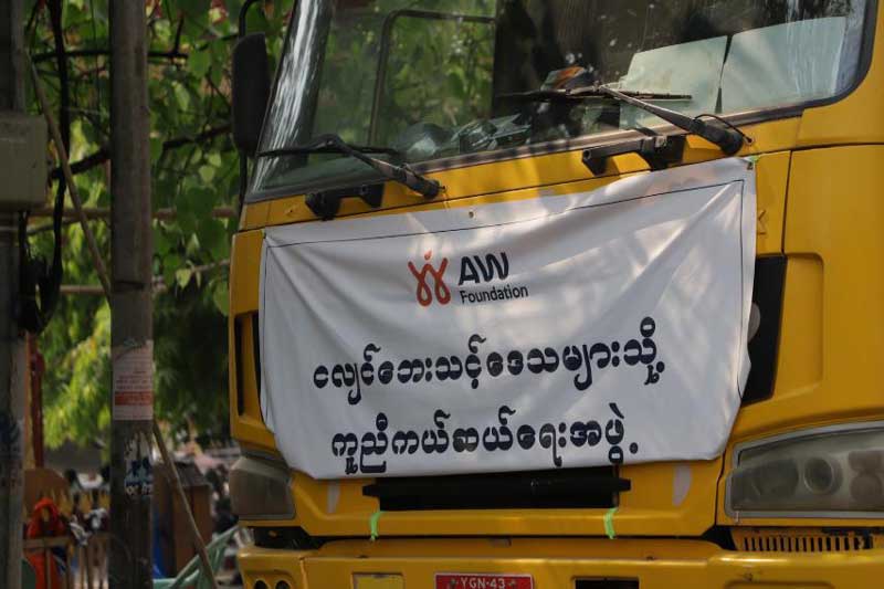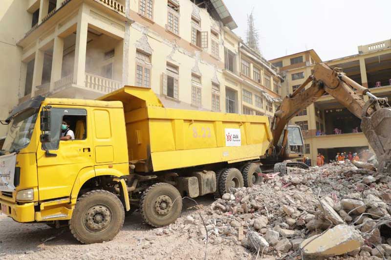 On April 4, 2025, AW Foundation mobilized 15 machinery units along with additional workforce to assist in the cleanup efforts in Mandalay, particularly in the Mandalay Palace area and U Hla Thein Pagoda complex. These areas were severely impacted by a powerful earthquake that caused significant building collapses and infrastructure damage. In collaboration with an Indian rescue team that had arrived to provide aid, AW Foundation contributed to the efforts by assisting with clearing debris in affected areas.